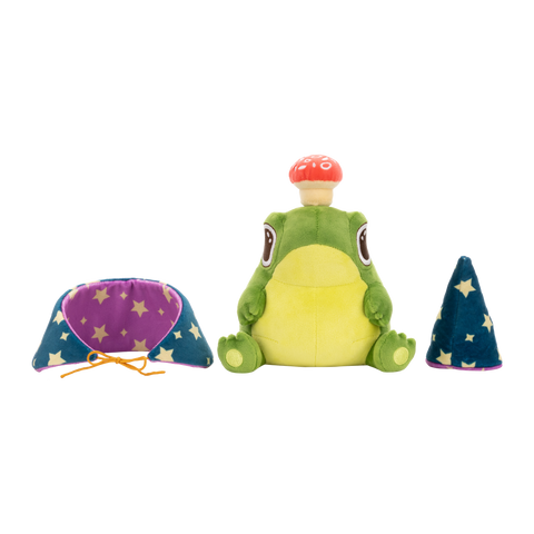 His cape and hat are removable; you can display him as a little wizard, or just as a little frog with a small red mushroom hat!